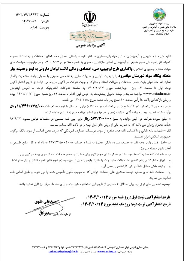 | آگهي در محدوده : | حوزه اداره کل منابع طبیعی و آبخیزداری مازندران-ساری |