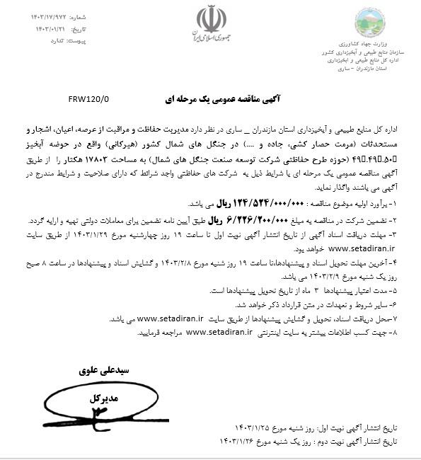 | آگهي در محدوده : | حوزه اداره کل منابع طبیعی و آبخیزداری مازندران-ساری |
